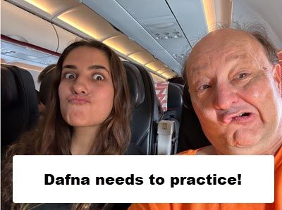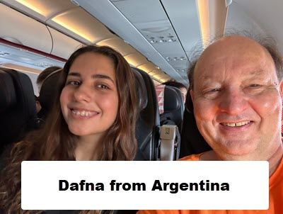 I spent a pleasant 2 hours talking to my seatmate Dafna from Argentina. Her English was terrific. She's 27 years old and is an optician in her family's business. Her sister was traveling with her and in another seat. Sofia is 21 years old. Since Sofia doesn't know me, I suggested a trick that I walk up to them at the baggage claim and address her by name. Dafna agreed so I did. I walked up, did a double-take, then said Sofia? Sofia? It's been years since I've seen you and I still recognize you. Dafna giggled and Sofia looked at her and knew she had been had. Fun times!