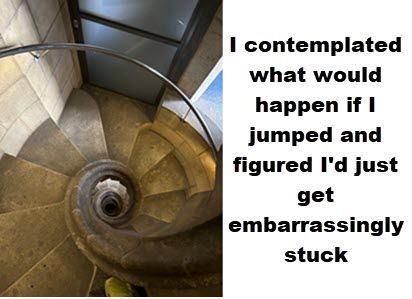I did two turns around the inside, taking some pics, and making sure I didn't miss anything important (hah). I saw a girl trying to get a selfie with a timer (which I know is tough and the angle sucks). I offered (in English) to take the pic and she agreed, thanking me with an American accent. I asked where she was from and she said she was from California. I was really on a mission to get out of there, so I didn't chat (can you believe that shit?) but headed to the elevator almost 40 minutes before my allotted time. I sweet talked the guard who looked at the short line and said go ahead. It's a one-way elevator trip. You have to walk down. They said it was 130 steps, but it seemed like a lot more. I didn't count and didn't go back up to check the count - plus it wasn't allowed to walk back up.