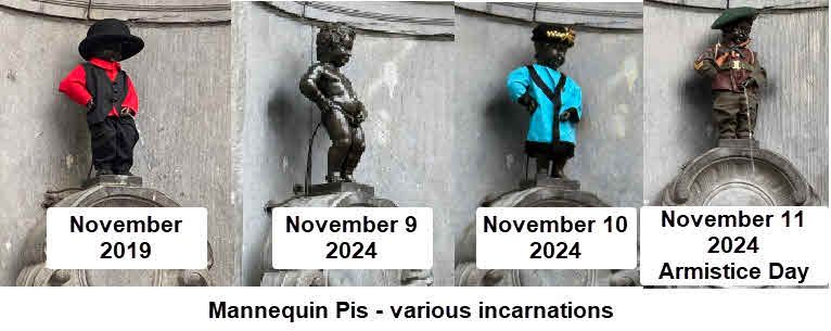 We passed by the Zinnekin Pis, a statue of a dog urinating on a hydrant. Wait for it, there is also a girl urinating, Jeanneke Pis. Brussels? Do you have a urination fixation? Perhaps it's the water. On Monday, I passed by Mannequin Pis again in a different outfit for Armistice Day, November 11.