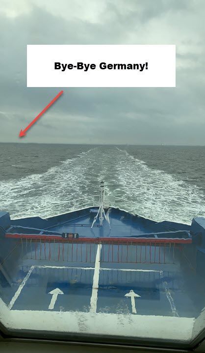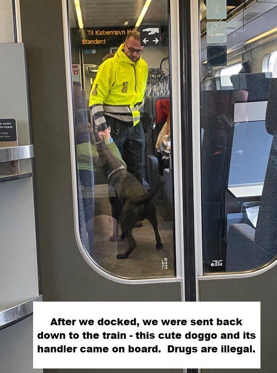 Since Germany and Denmark are both part of the EU, there was no immigration/passport check, but there was a drug-sniffing (we think) dog.