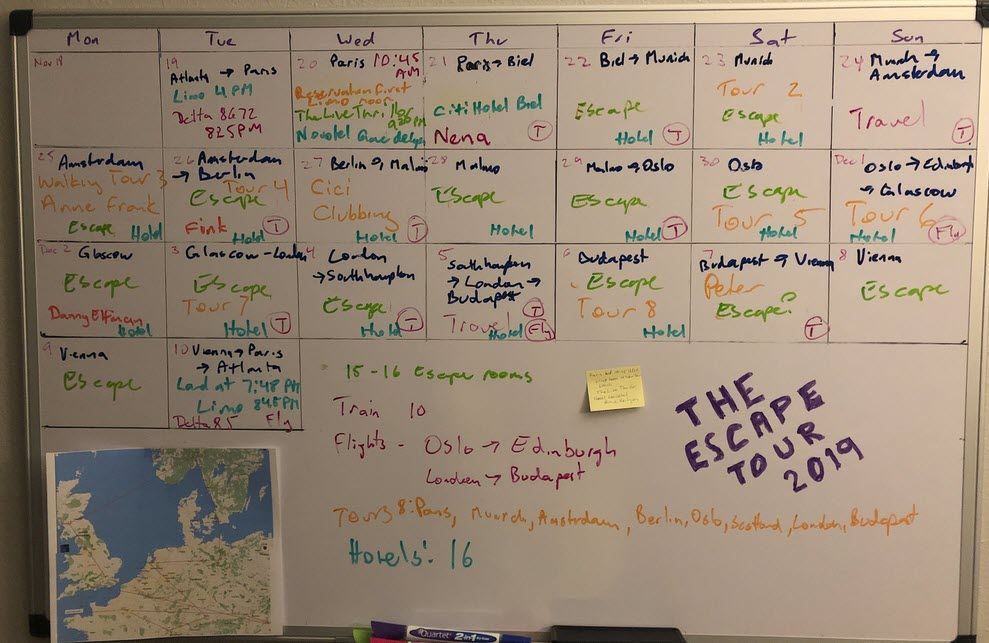 Every train trip had to be reserved, flights booked, as well as one bus ride. Hotels of course and all Escape Rooms. Plus concerts, comedy shows, and entry to a museum. I also got an multiple venue tourist pass for London. I had a blast organizing this.