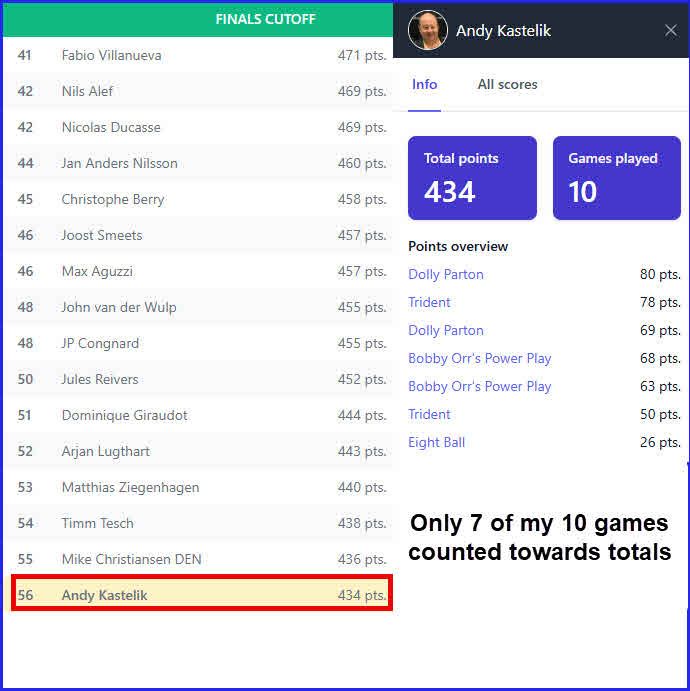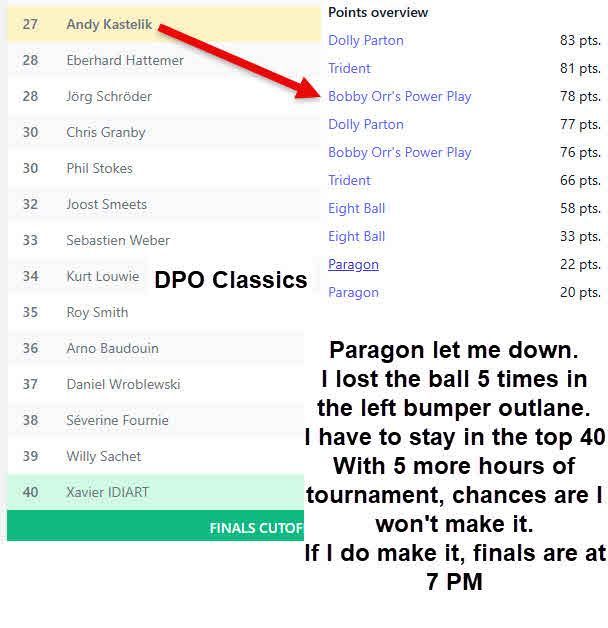 Today was Classics - basically, playing older machines. Each person gets 10 entries, and based on their score compared to the other players, points are earned. 100 for first place, dropping to zero around position 90. I was 130th and 138th on Paragon, so no points there. Out of my 10 entries, only 7 counted. There were 332 people entered.
