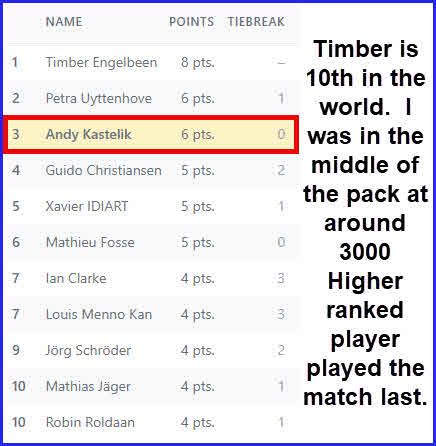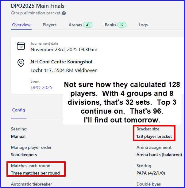 Tomorrow is the Main finals at 9:30 AM - a 96-player bracket. Top finishers get byes. Players in positions 2 and 3 face off first, three games per round. I’ll know more tomorrow.