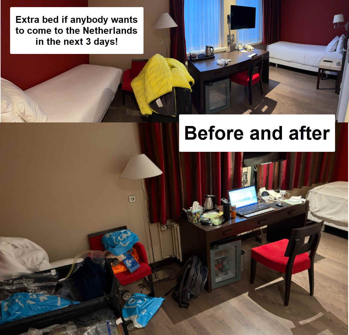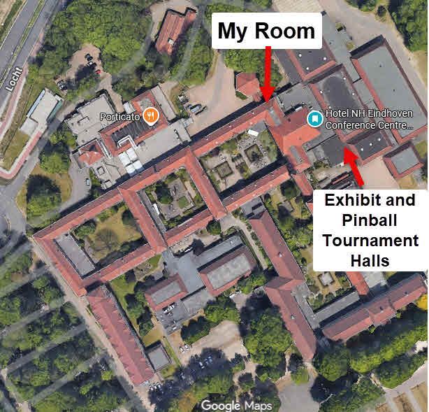 The room they gave me (one of the last available) had twin beds and vibes straight out of a 90s youth hostel, but with the Dutch Pinball Open happening this weekend, I’m lucky to be on site at all. Though totally my fault, I'm not unhappy with the room. It's at the very end of a long corridor, so it's quiet at night, and the stairs lead down to just outside the pinball venue! Check my before and after photos after I "set" up my mess. Complete tech hookup as usual with PC, phone, and Echo Spot to play music and "pink noise".